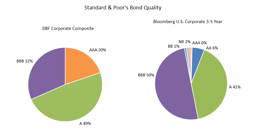 The Bloomberg U.S. Corporate 3-5 Year Index consists of investment grade, fixed-rate, taxable, USD-denominated securities issued by US and non-US industrial, utility, and financial issuers with remaining time to maturity of 3 to 5 years. The benchmark is a sub-index of the Bloomberg US Corporate Index. The benchmark index returns include the reinvestment of income and dividends but do not include management fees and transaction costs. Both DBF returns and index returns reflect the reinvestment of dividends and other earnings. Indices are included for comparison purposes only and do not include transaction costs. Volatility, number of issues, capitalization size, year-to-year return history, and other security attributes of the indices differ from the attributes of the DBF portfolios.