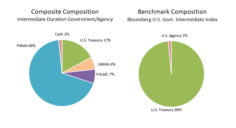 - The Intermediate Duration Government/Agency Composite includes all fixed income accounts, greater than $1 million, which contain exclusively U.S. Treasury notes, federal government agency securities, and federal agency mortgage-backed securities.